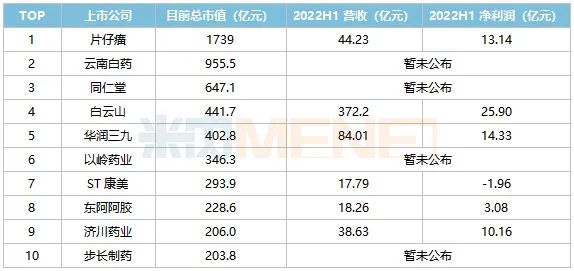 截至8月25日午間收盤(pán),A股中藥企業(yè)TOP10市值的門(mén)檻在200億元以上,但能堅(jiān)守千億市值的僅剩下片仔癀一家,老對(duì)手云南白藥跌至955.5億元,兩家的差距越來(lái)越大。目前TOP10企業(yè)已有6家公布了今年上半年業(yè)績(jī),片仔癀、白云山、華潤(rùn)三九、東阿阿膠、濟(jì)川藥業(yè)均實(shí)現(xiàn)了營(yíng)收和凈利潤(rùn)雙豐收。