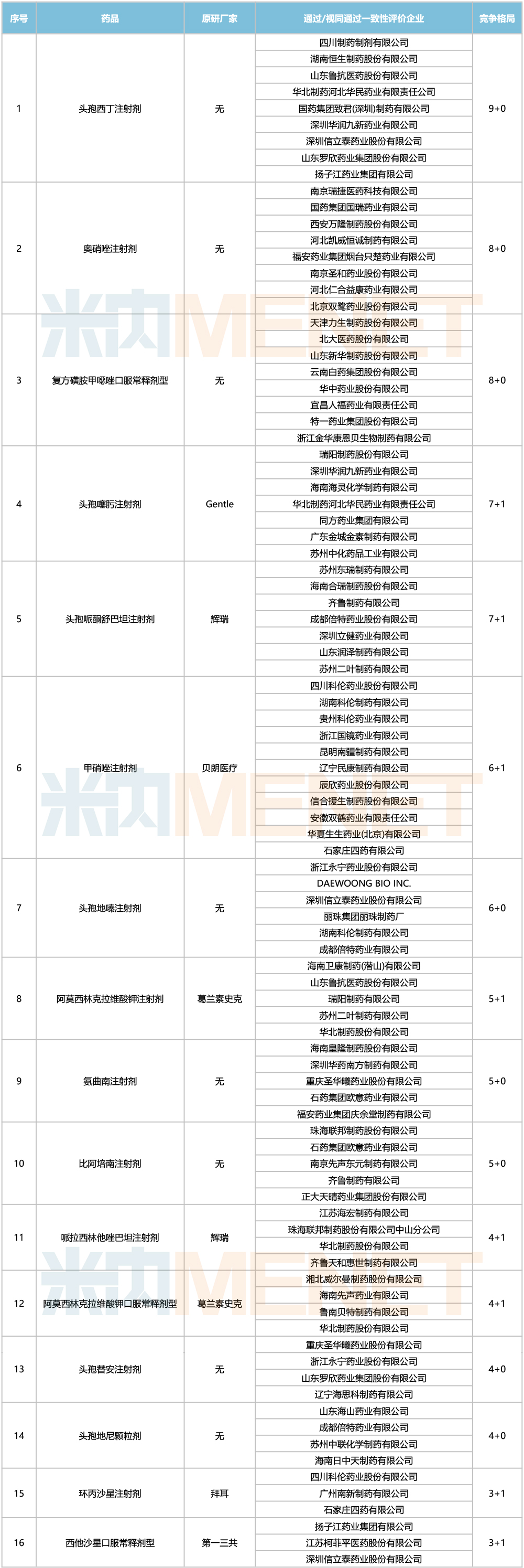 此外,甲硝唑注射劑雖然過評企業(yè)多達(dá)11家,但由于有6家企業(yè)同屬科倫集團(tuán),故該品種競爭格局為6+1。