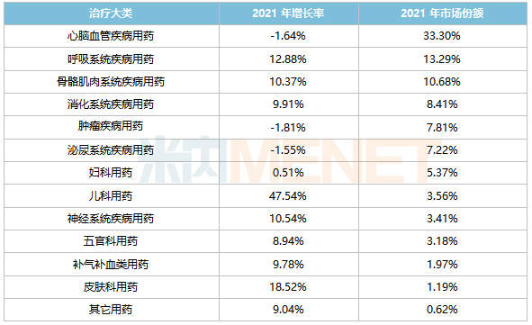 2021年中國公立醫(yī)療機(jī)構(gòu)終端中成藥各大類占比及增長情況
