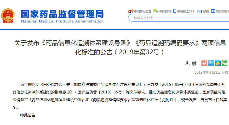 4月28日,國家藥品監(jiān)督管理局官網(wǎng)發(fā)布《關(guān)于發(fā)布<藥品信息化追溯體系建設(shè)導(dǎo)則><藥品追溯碼編碼要求>兩項(xiàng)信息化標(biāo)準(zhǔn)的公告(2019年第32號)》,正式宣布藥品追溯監(jiān)管碼體系將得到全新的部署。